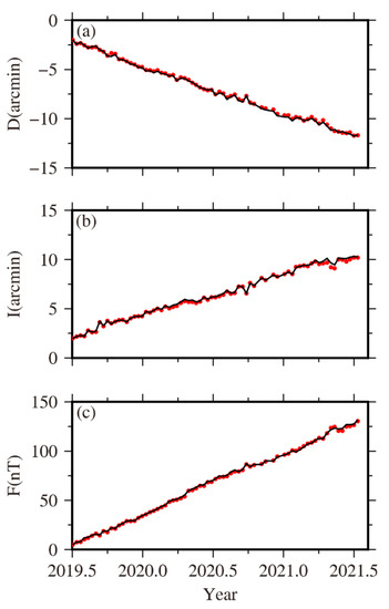 Here, we must investigate the error of repeat observation by analyzing the mounting error of magnetometers, diurnal reduction error, and secular reduction error. The maximum magnetic gradient of MD is 0.2 nT/m. Thus, the mounting error resulting from position deformation can be neglected. The larger RMS of diurnal reduction in 2019 and 2021 observed data are 0.11 arcmin, 0.03 arcmin, and 0.18 nT for D, I, and F, respectively, which can be regarded as the error of diurnal reduction. The sixth-order natural orthogonal component (NOC) of the geomagnetic fields from June 2019 to July 2021 is used to correct the secular variation. Figure 6 depicts the observed data in 72 quietest days and the values of NOC model from June 2019 to July 2021 on Jiayuguan geomagnetic observatory, which is one of the observatories used in the NOC model. The RMS of difference between observed data and NOC model is 0.08 arcmin, 0.1 arcmin, and 0.75 nT for D, I, and F, respectively, which can be regarded as the error of secular reduction. The total error can be calculated by the accuracy of instruments, diurnal reduction error, and secular reduction error, which are 0.24 arcmin, 0.22 arcmin, and 0.80 nT for D, I, and F, respectively. As Y is primarily dependent on D, the total error of Y can represent by the error of D, which is about 2.2 nT in MD for 0.24 arcmin.