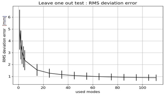 - The Leave-one-out Test analyzes how well the SSM describes patients who are not part of the input population. To perform this test multiple SSMs are generated, leaving out each input patient in turn. For example, with an input population of 112 patients, 112 different SSMs are built with 111 patients. Each of those 111 SSMs is built with an increasing number of modes. The average RMS deviation between the SSMs is computed.