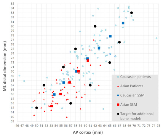The crucial step to practically use the SSM for implant design was to generate a database of bone models out of the average SSMs. The seven Caucasian and five Asian bone models generated represented the average population well. Their AP/ML dimensions were located in the center of the cloud of points representing the AP/ML dimensions of the different patients. An additional 10 statistical models were computed to represent not only the average but also the patients with AP/ML dimensions at the borderline. Hence, a database of 22 bone models statistically well represented the Caucasian and Asian populations.
