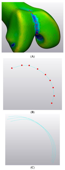The deepest points of the trochlea are depicted in Figure 7A. The resulting spline for one size is depicted in Figure 7B. Figure 7C shows the comparison of splines obtained with femurs of different sizes.
