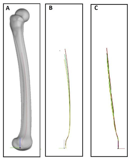 Splines of the center of the femoral canal in the frontal and sagittal planes were depicted for SSMs of different sizes (Figure 8) and are a useful input for defining the optimal curvature of long stems.