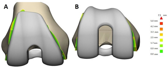 The numerical color map enabled to visualize the differences between the models (Figure 2). ‘OA-SSM’ and ‘healthy SMM’ differed on average by 1 mm. Some differences were visible on the distal and posterior condyles, as well as on the shape of the articular surface of the patella.