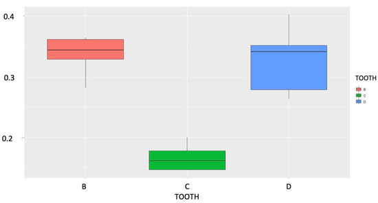 At first, a statistical analysis was carried out to analyze whether there was a statistical difference between tooth C and E regarding average roughness. A Student’s t-test was applied, after verifying that variables follow a normal distribution (p-value > 0.05, Kolmogorov–Smirnov test = 0.13).