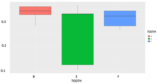 Box-plot regarding ‘Toothpaste B’. Tooth B, E and F represents tooth condition as in Table 1.