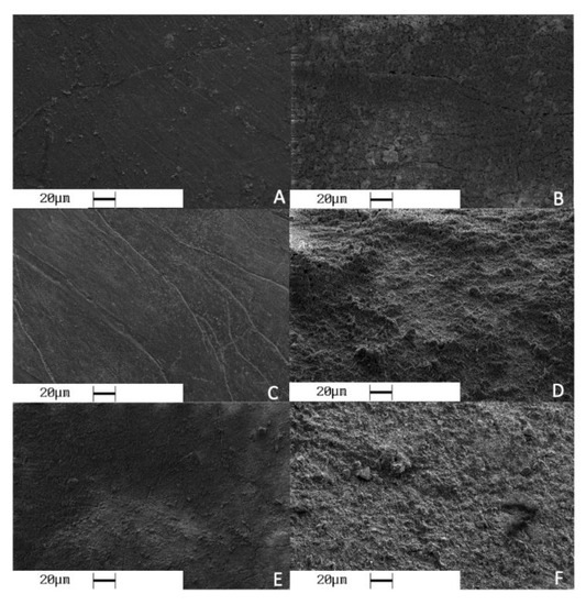 SEM observations: (A) intact and polished enamel; (B) enamel subjected to acid attack; (C) enamel treated with toothpaste A; (D) enamel treated with toothpaste A and second acid attack; (E) enamel treated with toothpaste B; (F) enamel treated with toothpaste B and second acid attack.
