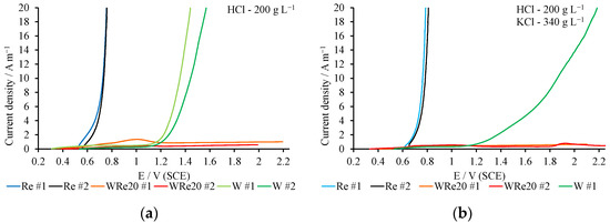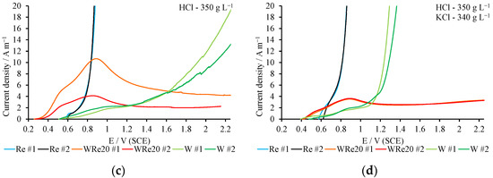 Linear voltammetry was used to study the anodic process occurring on individual rhenium, tungsten, and tungsten–rhenium electrodes. Figure 1 shows that rhenium was dissolved in all solutions according to the mechanism of the delayed ionization. The active dissolution stage began at the potential of 600 mV relative to the silver chloride electrode. At current densities below 20 A/m2, the addition of potassium chloride practically did not affect the course of the polarization curve. However, at high current densities above 2500 A/m2, the addition of potassium chloride caused electrode salt passivation and the formation of potassium chlorrenate.