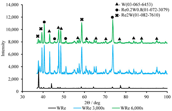 The samples of the tungsten–rhenium alloy after potentiostatic dealloying were subjected to X-ray phase analysis using a Rigaku D/MAX-2200VL/PC X-ray diffractometer (Rigaku, Japan) (Figure 3). It was found that after dealloying, new phases (for example, an oxide film) were not formed on the surface of the samples. This indicates the absence of the process passivation and favorably affects the depth of extraction of rhenium from the alloy.