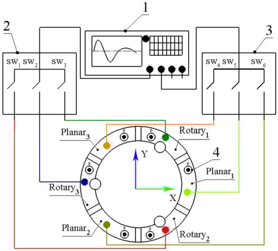 Excitation schematics of the actuator; 1—signal generator; 2—switching box used for angular motion control; 3—switching box used for linear motion control; 4—polarization direction of piezoceramic ring.