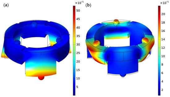 Modal shapes of the actuator: (a)—the first radial mode (18.02 kHz); (b)—the third radial mode of the piezoceramic ring (46.199 kHz).