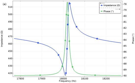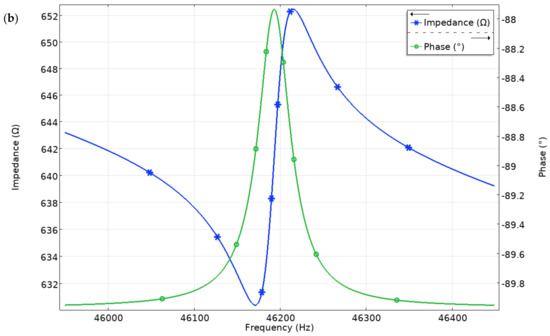 Impedance and phase characteristics in the frequency range of 17.76–18.29 kHz (a) and 45.96–46.46 kHz (b).