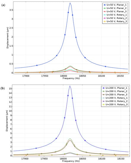 Harmonic response analysis also was performed to analyze amplitudes of contacting points vibration. The calculations were made when the voltages of 50 Vp-p and 200 Vp-p were applied for both modes. A single electrode was excited. Coupling between vibrations of different contact points was analyzed as well. Figure 6a shows that the highest displacement amplitude was obtained at a frequency of 18.017 kHz. The frequency value is in good agreement with the results of impedance frequency analysis. Also, it can be seen that the contact point located at the support under the excited electrode (Planar1) has the highest displacement of 3.91 μm. The ratio between displacement amplitude and applied voltage is 78.2 nm/Vp-p. On the other hand, it can be observed that contact points located on the passive segments (Planar2 and Planar3) generate notably lower displacement amplitudes, i.e., 380 nm and 340nm. In addition, contact points located on segments for angular motion, Rotary1–Rotary3, also vibrate with amplitudes of 183 nm, 151 nm, and 136 nm, respectively. The coupling ratio between vibration amplitudes of excited and passive planar segments does not exceed 11.5 times and is not more than 28.75 times between excited segment and passive segments of angular motion. Figure 6b represents the displacement-frequency characteristics of the actuator while excitation signal amplitude was set to 200 Vp-p and was applied on electrode Planar1. The highest displacement amplitude of the active segment reached 15.61 μm or 78.05 nm/Vp-p. The contact points located on Planar2 and Planar3 segments have amplitudes of 3.81 μm and 3.45 μm, respectively. Therefore, the ratio between active and passive planar segments is 4.52 times. Analyzing vibration amplitudes of contact points located on Rotary1–Rotary3 segments, it can be seen that it reaches 751 nm, 648 nm, and 557 nm, respectively. The coupling ratio of vibrations amplitudes is around 21 times in this case. Therefore, coupling between vibrations increases when excitation voltage increases as well. This means that when high voltage is applied, it will be complicated to achieve the planar and rotational motion of the payload independently. The same studies were performed for contact points driven by Planar2 and Planar3 segments in order to fully investigate displacement amplitudes and indicate vibrations coupling between all actuator segments while 200Vp-p is applied. A summary of the investigation is given in Figure 7.