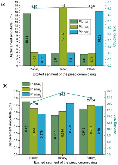 As can be found in Figure 9a, displacement amplitudes of all contact points located on rotary segments are similar. The differences do not exceed 6.16%, while vibrations coupling ratios are also almost the same. The difference in the coupling ratio does not exceed 11%. Therefore, it can be stated that the influence of coupling vibrations between rotary segments will have a minor influence on angular motion direction. In addition, considering to results represented in Figure 9b, it can be found that the coupling ratio between rotary and planar segments is up to 17.39 times, while fluctuations between coupling ratio values do not exceed 6.15%. Therefore, it can be assumed that during the excitation of angular motion, the actuator will not generate planar motion and will stay in a constant position.