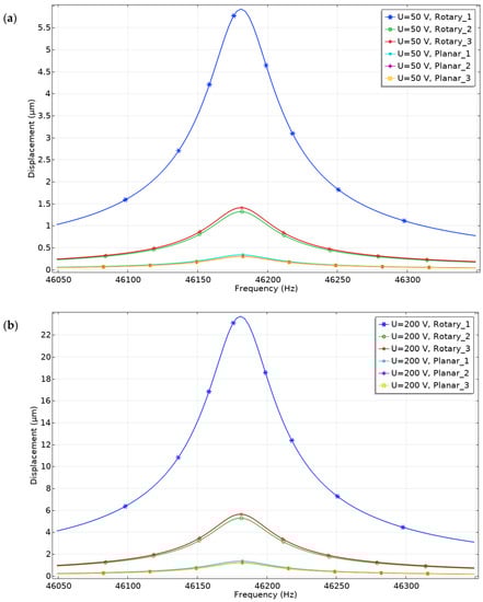The maximum displacement amplitudes were obtained at a frequency of 46.18 kHz. It confirms the results of impedance and phase-frequency characteristics calculations. The maximum displacements of 5.92 μm and 23.15 μm were obtained when excitation voltage of 50 Vp-p and 200 Vp-p were amplitudes to segment Rotary1, respectively. The ratio between displacement amplitude and applied voltage is 118.4 nm/Vp-p and 115.7 nm/Vp-p, respectively. The coupling ratio between vibrations of rotary segments is up to 4.19 times when 50 Vp-p was applied and 4.1 times when 200 Vp-p was applied. It can be seen that the coupling ratio of vibrations between rotary segments is similar at different excitation voltages. Moreover, the coupling ratio of vibrations between rotary and planar segments is up 17.4 times while 50 Vp-p was applied and up to 17.14 times while 200 Vp-p was applied. In order to fully investigate the coupling ratio, the numerical investigation was performed when rotary segments Rotary2 and Rotary3 were affected by 200 Vp-p. A summary of the investigations is given in Figure 9.