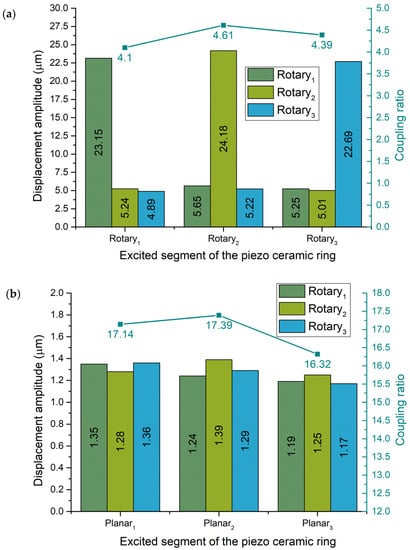 Comparison of spherical contacts displacement amplitudes and coupling ratios located in rotary segments (a) and planar segments (b) when corresponding rotary segments are excited by the voltage of 200 Vp-p.