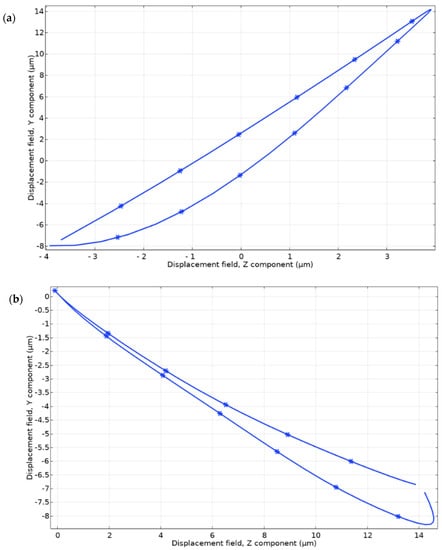 Motion trajectories of contact spheres at the resonant frequencies of 18.017 kHz and 46.199 kHz were studied as well. Time-domain studies were set for both vibrations modes. Time ranges were set to one period of vibrations (T). Excitation voltage amplitude was set to 200 Vp-p for both cases. Electrodes located on segments Rotary1 and Planar1 were affected by excitation voltage separately, while other segments were set to open-circuit conditions. Results of calculations are given in Figure 10. It can be seen that motion trajectories have almost linear trajectories in both cases. The projection of the motion trajectory in the Y-axis is 22.34 μm, while the projection in X-axis is 7.18 μm (Figure 10a). The length of the trajectory is 23.47 μm. Projection of angular motion trajectory of contact sphere motion reached 8.8 μm and 15.61 μm in Y and Z axes, respectively. The length of the trajectory is 17.92 μm.