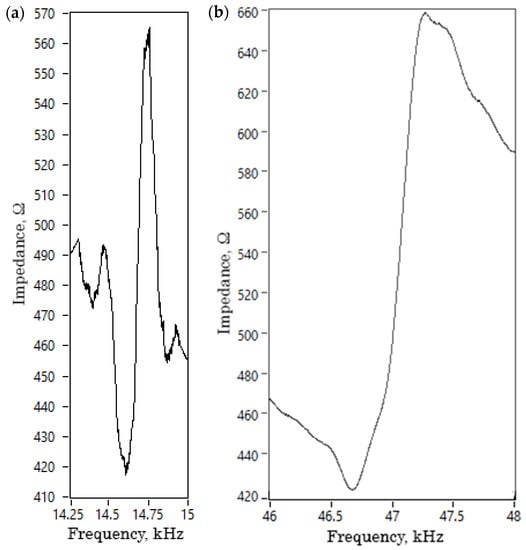 Measured impedance—frequency characteristics of the actuator in the frequency range of 14.25–15.00 kHz (a) and 46.0–48.0 kHz (b).