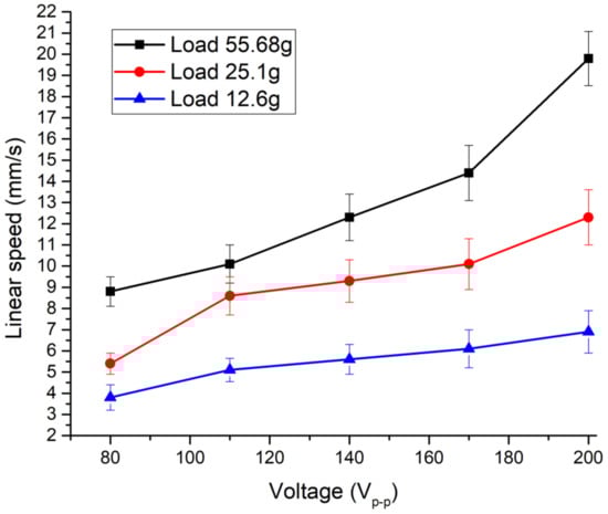 The actuator was placed on the flat glass surface, and the planar velocity of the actuator was measured. Excitation voltage varied from 80 Vp-p to 200 Vp-p, and a payload of 12.6 g, 25.1 g, and 55.68 g was applied. Firstly, measurements were made while the electrode located in segment Planar1 was excited while other electrodes were set to open-circuit conditions. The payload of the actuator was changed manually by replacing the spherical payload. Results of the measurement are shown in Figure 14.