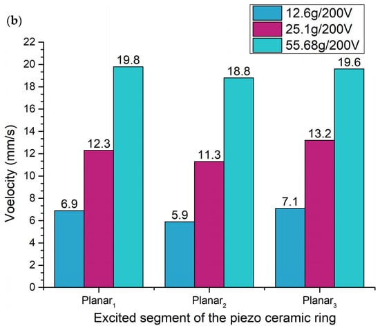 The lowest and highest velocities of the actuator were obtained at 80 Vp-p and 200 Vp-p, respectively. The lowest velocity values reached 3.8 mm/s at 12.6 g, 5.4 mm/s at 25.1 g and 8.8 mm/s at 55.68 g, while the highest reached 6.9 mm/s, 12.3 mm/s and 19.8 mm/s, respectively. It can be noted that velocity characteristics are almost linear increases when voltage is increasing. Also, a higher preload value causes higher velocity because of the increment of friction force between surface and contact spheres. More detailed measurements of the planar velocity were made when electrodes located in segments Planar2 and Planar3 were excited. Comparison of the measured maximum and minimum velocities at different payloads are given in Figure 15. It can be seen that velocities have minor differences at different payloads when the voltage of 80 Vp-p and 200 Vp-p is applied. The difference value does not exceed 9.49%. It shows that the actuator is able to provide stable planar motion characteristics in different directions at different payload values. The highest velocities of 8.8 mm/s, 8.6 mm/s, and 8.3 mm/s were obtained when a payload of 55.68 g and voltage of 80 Vp-p were applied on corresponding electrodes (Figure 15a). On the other hand, the highest velocities of 19.8 mm/s, 18.8 mm/s, and 19.6 mm/s were obtained when the voltage of 200 Vp-p was applied, and a payload of 55.68 g was used. Video S1 was included to supplementary materials in order to represent planar motion of robot.