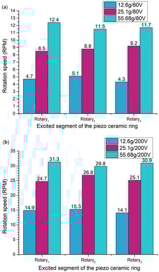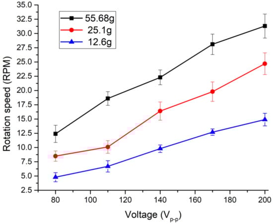 The lowest angular speed of 4.8 RPM, 8.5 RPM, and 12.4 RPM was obtained at 80 Vp-p when preload of 12.6 g, 25.1 g, and 55.68 g was applied. The highest angular speed values of 14.9 RPM, 24.7 RPM, and 31.3 RPM were obtained at 200 Vp-p at the same preload values. Also, it can be seen that angular speed is almost linearly increased when excitation voltage is increasing. Angular speed also depends on payload, i.e., the higher payload causes higher friction force and angular speed, respectively. Measurements of the angular velocity were also made when electrodes located in segments Rotary2 and Rotary3 were excited. A summary of the results is given in Figure 17.