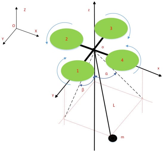 Building a suitable and complete model of a quadrotor carrying a load is the basis of the control algorithm. The quadrotor is a standard cross-shaped quadrotor with a general structure. The body coordinate system of the quadrotor is defined as , the inertial coordinate system is defined as and is the spatial position coordinate of the inertial coordinate system of the quadrotor. The front and rear direction of the quadrotor is the X-axis direction, and the backward direction is negative. The left and right direction is the Y-axis direction, and the right direction is positive. The up and down direction is the Z-axis direction, and the upward direction is positive. The moving speed of the quadrotor is expressed as . is the Euler angle of the space attitude. The roll angle around the X-axis rolls to the right in the positive direction. At this time, the rotation speed of rotor 2 increases, and the rotation speed of rotor 4 decreases. When the nose is down, the pitch angle around the Y-axis is in the positive direction. In this case, the speed of rotor 1 increases, and the speed of rotor 3 decreases. The yaw angle around the Z-axis rotates counterclockwise in the positive direction. At this time, the speeds of rotor 1 and rotor 3 remain unchanged, and the speeds of rotor 2 and rotor 4 increase. The rotational angular velocity is . is the projection angle of the hanging rope on the surface of the quadrotor, is the projection angle of the hanging rope on the surface of the quadrotor, L is the rope length, l is the half-length of the motor shaft, the weight of the quadrotor is M and the weight of the hanging load is m, so the resulting model of a quadrotor carrying a load is shown in Figure 1.