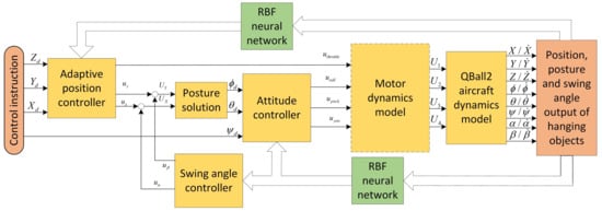 In the figure, , , are the expected height, Y position and X position of the quadrotor, respectively. is the height control quantity output by the height controller to the motor, and are the output of the horizontal position controller, and combined with the output , of the hanging swing angle controller, the final horizontal direction control quantity , can be obtained. Considering the coupling effect of the yaw angle and the expected roll angle, pitch angles and are obtained after attitude calculation. Combined with the given expected yaw angle as the control variable of the attitude angle controller, the output to the motor’s horizontal and the control variables of the roll angle, pitch angle and yaw angle are , , , respectively. , , , are obtained by allocating the four control variables of the motor, which is the PWM value of the motor, which defines the virtual control value , , , . The output of eight channels can be obtained from the system model , , , , , , , .