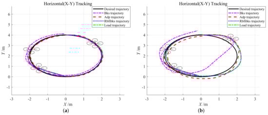 The simulation denotes the backstepping algorithm, denotes the adaptive integral backstepping algorithm and denotes the neural network adaptive algorithm based on integral backstepping. Each channel of the controller is compared and simulated using the neural network adaptive integral backstepping algorithm and the existing adaptive integral backstepping algorithm. In Figure 4 and Figure 5, the neural network adaptive integral backstepping algorithm can track the desired curve quickly and stably, and the tracking effect is closer to the desired curve than the adaptive integral backstepping algorithm and the backstepping algorithm. Among them, the green dashed line is the trajectory curve of the hanging load, while a quadrotor and its load are given for one sampling moment during the simulation.