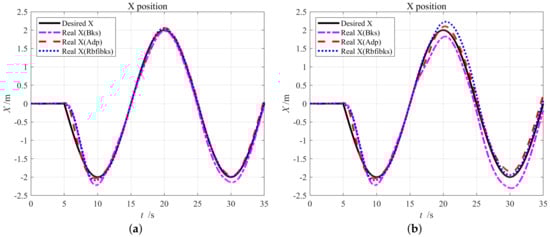 X-axis change of a quadrotor carrying a load system: (a) weak interference; (b) strong interference.