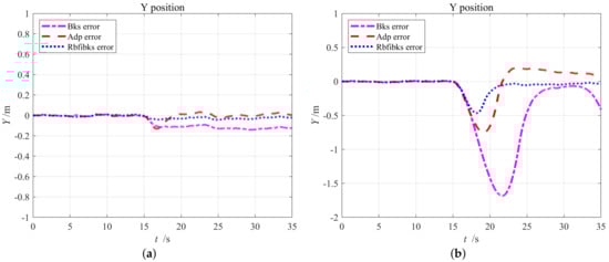 In Figure 8 and Figure 9, the pink curve represents the backstepping algorithm, the red curve represents the adaptive integral backstepping algorithm, and the blue curve represents the algorithm proposed in this article. It can be seen from the figure, all three methods can be stabilized quickly, but from the perspective of local scaling, the adaptive integral backstepping method and backstepping method produce larger overshoot, generate larger fluctuations, and take a longer time. The neural network adaptive integral backstepping algorithm can be stabilized quickly and with less overshoot. From the error point of view, the error fluctuation of the adaptive integral backstepping method is larger, which indicates that the addition of a neural network can better ensure the stable tracking of the trajectory in the case of external disturbances of different intensities. Table 3 below shows the comparison of the average error of different algorithms on the Y-axis under different interference intensities. It is obvious from the table that the average error of the algorithm proposed in this paper is the smallest, and its performance is significantly improved compared to the integral backstepping algorithm and the backstepping algorithm.