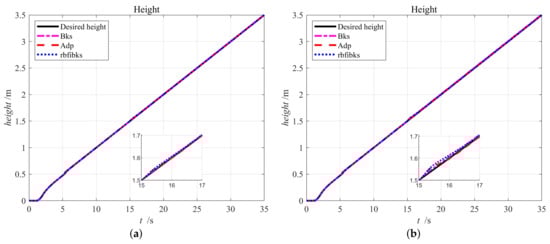 During the experiment, the Qball2 quadrotor started to take off and began to ascend. At the fifth second, the quadrotor reaches an altitude of 0.5 m and starts to track according to: orbit. At the 15th second, add the superimposed wind field as interference to the eight-degree-of-freedom mathematical model of a quadrotor carrying a load, and compare two different strengths of interference according to the strength of the wind field. The Simulink simulations are compared with the adaptive integral backstepping algorithm and the backstepping algorithm for these two strength disturbances. The simulation time is set to 35 s. The simulation plots are shown below, the left column is (a) and the right column is (b).