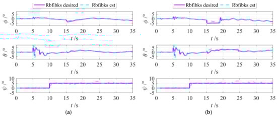 An attitude angle change of a quadrotor carrying a load system: (a) weak interference; (b) strong interference.