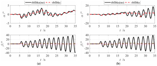 , swing angles of a quadrotor carrying a load system: (a) weak interference; (b) strong interference.