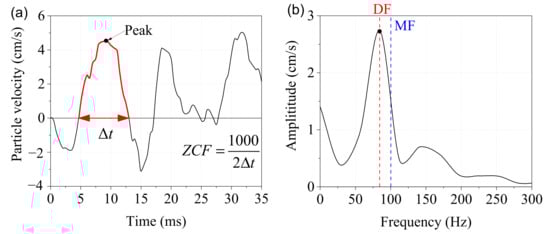 There are two common approaches for defining the dominant frequency of a blast vibration: zero-cross frequency (ZCF) and Fourier dominant frequency (hereafter DF). The ZCF, also known as apparent frequency [], is determined based on the zero-crossing of the waveform peak; its definition is shown in Figure 1a. The DF corresponds to the peak amplitude in the Fourier power spectrum, as shown in Figure 1b. The mean frequency (MF) and instantaneous frequency (IF) have also been common in recent years. The MF is obtained by calculating the weighted mean of the Fourier amplitude spectrum using Equation (1), as shown in Figure 1b. The above four dominant frequencies are extensively used in research [,,], with the ZCF and the DF being the most common.