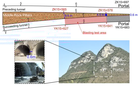 In blasting engineering, a part of the explosion energy is used to break a rock and the remainder is transmitted to the surrounding rocks by the blasting vibration waves [,], which may be a significant threat to the safety of the adjacent structure [,]. In small-spacing tunnels, after the primary support and secondary lining of the preceding tunnel are completed, its structure and the middle rock pillar may be affected by the blasting vibrations of the succeeding tunnel, which are manifested as seismic cumulative effects []. For example, the repeated blast loading during tunnelling works causes damages on jointed basalt rock masses []; and the cyclic blast excavations cause the critical damage PPV for the middle rock pillar drops significantly []. Meanwhile, the blast vibration waves may cause a decline in the bearing capacity of the rock [,] and some increases in the stress of the anchors [], concurrently, the excavation damaged zone and deformation modulus of the surrounding rock is also influenced []. Recently, owing to the limited space in mountainous areas, small-spacing tunnels are becoming common [], where the clearance between two tunnels is much shorter than the safe distance to alleviate vibration waves, such as Eurasia Tunnel [], El-Azhar roadway twin tunnels [], Liuyuetian bifurcation tunnel [], Heshang three-lane tunnel [], and closely spaced triple tunnels in Badaling []. Periodic non-uniform natural seismic wave excitation causes shear deformation in underground constructions []. And one of the biggest differences between blasting vibration waves and natural seismic waves is the difference in frequency characteristics, where the seismic waves are in low frequency ranges and the blast vibration waves frequency is higher, generally greater than 5 Hz. Therefore, it is necessary to analyze the characteristics of blast vibration waves propagating in the area very close to the tunnels so as to help protect the tunnel structure.