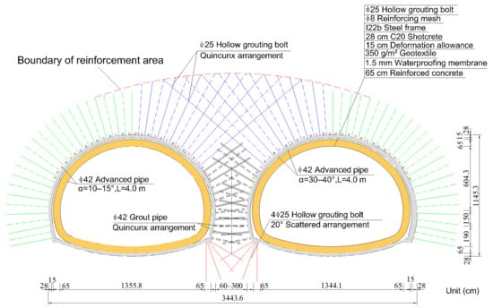 The design of the tunnel is shown in Figure 3. To ensure the safety and stability of the construction, the middle rock pillar was reinforced. Small grouting conduits were used. An extended hollow grouting bolt was set above the middle rock pillar, and four hollow grouting bolts were installed under the middle rock pillar, to reinforce the arch foot. The deformation space reserved for the primary support and the secondary lining was 15 cm.