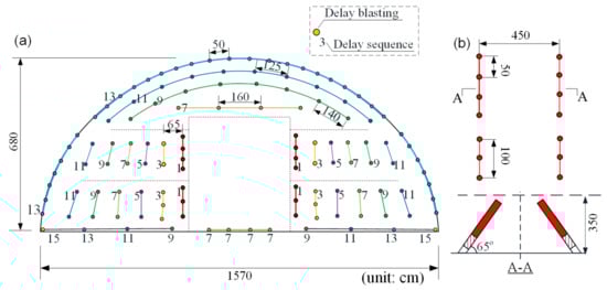 The typical blast parameters of the succeeding tunnel at the upper bench were recorded, and are shown in Figure 4 and summarized in Table 1. The blast section size was 15.7 m × 6.8 m (span × height). The blasting parameters were the basically same in each blast circle: the number of blastholes was approximately 140–150, and the footage per cycle was approximately 3.5 m. There was a continuous charge in each blasthole (with 42 mm in diameter), and a single weight of the rock emulsion explosive was 300 g, with a diameter of 32 mm and a length of 300 mm. Each full-face blasting was divided into several delays, and the non-electric MS detonators were employed. The cutting blastholes were detonated in MS1, creating new free surfaces for the subsequent blastholes. The helper blastholes were successively detonated in MS3–MS11. The contour and floor blastholes were detonated in MS13.