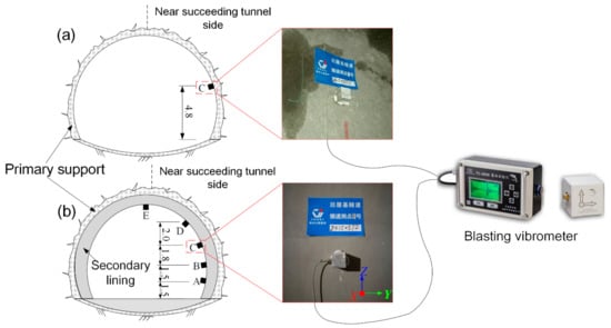 The blasting face of the succeeding tunnel was gradually advanced, and its parallel position passed through the secondary lining and primary support of the preceding tunnel sequentially. Measuring sensors were arranged on the inner surfaces of the preceding tunnel; they were fixed on the primary support and secondary lining using gypsum stirred on site. The arrangement of the measuring points on the site is shown in Figure 5. The sampling frequency of the blasting vibrometer was 2 kHz.