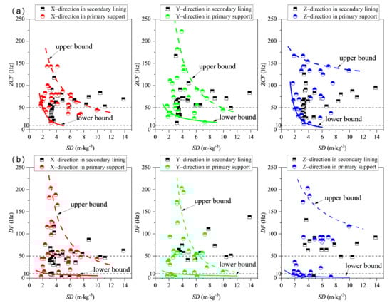 The blasting vibration waves on the primary support and the secondary lining were monitored. The relationships between the SD and the frequencies (DF and ZCF) were illustrated in Figure 6. In the data of the primary support, the dominant frequencies in the Y– (longitudinal) and X–directions (vertical) show some regularity, whereas the regularity of those in the Z–direction (transverse) is poor. The dominant frequencies are mainly distributed within 200 Hz, and the distribution range of the ZCFs generally exceeds 10 Hz, whereas a part of the DFs is widely distributed below 10 Hz. In the range of the SD less than 5.0 kg/m3, the dominant frequency of the vibration wave is greater than 100 Hz; and in the range of more than 10.0 kg/m3, the high frequencies part attenuates to the range of less than 50 Hz. The prediction of the dominant frequency was extensively developed by the SD [,]. The variations in the upper and lower bound values of the dominant frequency on the primary support with the SD can be expressed as power functions (as shown in Figure 6 and listed in Table 4). The change in the upper bound can be understood as the attenuation of the high-frequency part of the dominant frequency, in which the dominant frequencies in the X– and Y–directions decay rapidly, whereas that in the Z–direction (transverse) decays gradually. The characteristic that the dominant frequency gradually attenuates with the increase in the distance is mainly caused by the damping of the surrounding rock and the high-frequency absorption by the nonlinear properties []. An alternative explanation for these phenomena may be that the vibration waves close to the blast are more affected by characteristics of blast design, while at larger distances the propagating medium dominates the vibration response [].