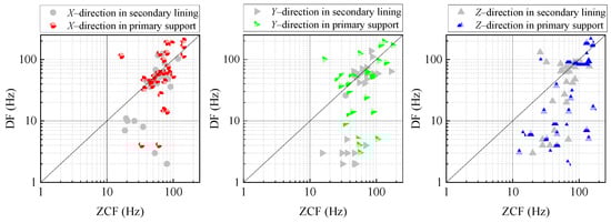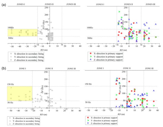As the blast face in the succeeding tunnel advances gradually, the blast-affected area in the preceding tunnel changes from the secondary lining to the primary support. As shown in Figure 7, when the lining is located at different RD, the dominant frequency distributed on it is variant. For example, the dominant frequencies do not have a specific range when the blasting face is close to the lining (RD = 0). When the RD is less than a certain value (RD = −16 m), the dominant frequencies on the lining are concentrated in an interval, either ZCFs or DFs. In contrast, in the range of RD > 16 m, the dominant frequencies on the primary support are still relatively discrete. To a clear illustration, Figure 7a,b are divided into zones I, II, and III, respectively. The measurement points on the lining are distributed in zones I and II, while the measurement points on the primary support are distributed in zone II and III. The dominant frequencies of the primary support are obeyed with the characteristics of high-frequency attenuation, while the data on the lining are not submitted to it.