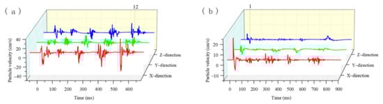 Vibration velocity waveforms of blasting vibration waves. (a) PPV occurs in MS12 and (b) PPV occurs in MS1.