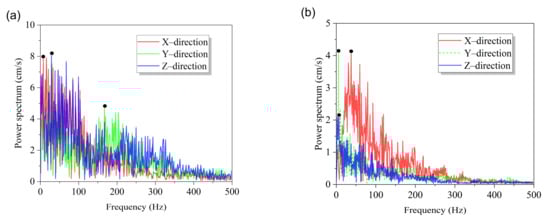 The Fourier power spectrum of the waveform in Figure 8 is shown in Figure 9. There are several peak amplitudes in the power spectrum, indicating that the complete vibration velocity waveform is a superposition of different frequency vibrations. When the MS delay blasting was used in excavation, if a power spectrum reflecting all sequences respectively could be obtained, it may better present the true scenario of the entire vibration compared with a global frequency of all delays [].