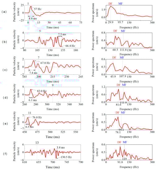 In the blasting works of tunnels, the MS delay blasting technique was typically adopted to restrict the charge weight in a single detonated sequence for meeting the control criterion of safety []. Two typical vibration velocity waveforms of an MS delay blasting are illustrated in Figure 8, and the Arabic numerals marked at the top of each figure are the delay sequence. The PPV in the curve in Figure 8a occurs in MS12, whereas in the Figure 8b curve, it is observed in MS1, which is mainly related to the average explosive weight in each delay sequence. It can also be seen from the figure that the complete vibration velocity waveform of the MS delay blasting is composed of multiple vibration waveforms that are detonated in different delays. On converting the vibration velocity waveform from the time domain to the frequency domain, the power spectrum contains several frequency components that are contributions of multiple vibration waveforms (as shown in Figure 9).
