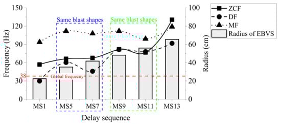 As shown in Figure 10, the ZCF is depicted near the peak of each waveform and the DF is depicted at the peak amplitude in the power spectrum. Overall, the ZCF and the DF are increased as the delay sequence grows; however, it is not a completely linear trend. To better describe it, the MFs are calculated in Table 5, and three dominant frequencies (ZCF, DF, and MF) of each delay sequence are depicted in Figure 11. It is seen that the global frequency of the entire vibration is close to the DF of the cutting blastholes in MS1.