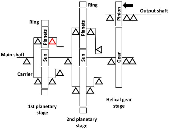 Schematics of the three-stage gearbox, with the damaged bearing highlighted in red and the position and direction of the output channels indicated by the black arrow.