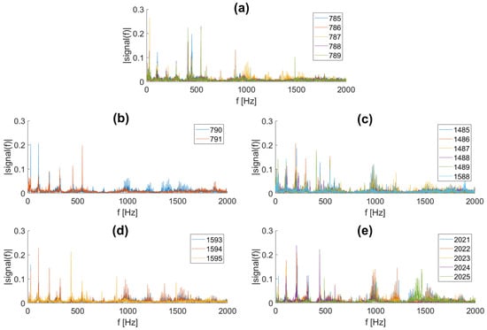 Fast Fourier Transforms (FFTs) of the segments of each set included in signal #2. (a): training set; (b): validation set #1; (c): validation set #2; (d): test set #1; (e): test set #2.