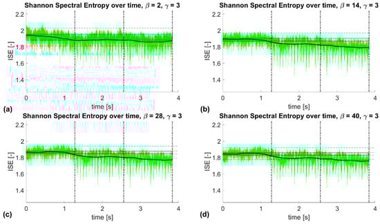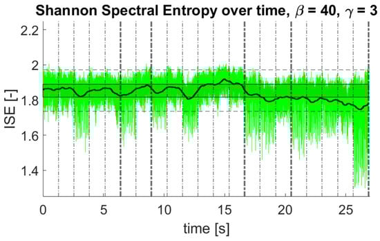 An example of results is reported in Figure 4. The green line corresponds to the Instantaneous Spectral Entropy, defined at any timestep. The two horizontal dashed lines correspond to the upper and lower bounds of the Gaussian distribution fitted over the ISE values of the training set, that is to say, and , where and correspond, in the same order, to the mean and standard deviation of the baseline tract, which is assumed to be almost stationary.
