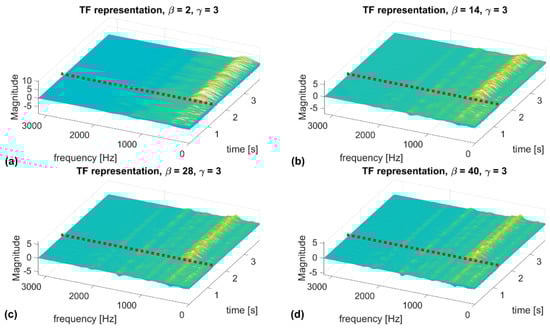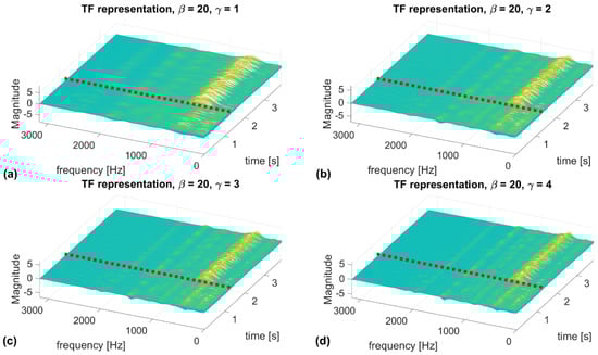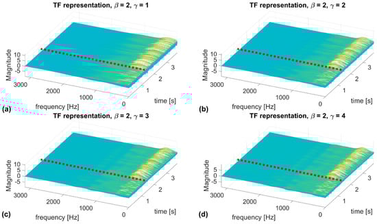 Time–frequency distributions corresponding to the results shown in Figure 4 ( and equal to (a) (b) , (c) , and (d) 40).