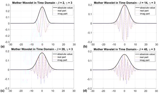 Mother wavelets (in the time domain) corresponding to the results shown in Figure 4 ( and equal to (a) (b) , (c) , and (d) 40).