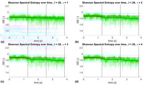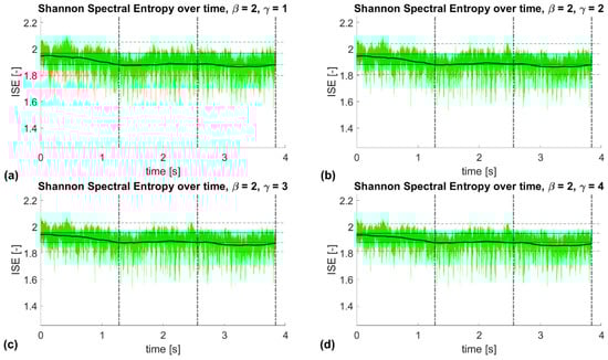 In this research, the Instantaneous Spectral Entropy is proposed as a damage-sensitive index for condition monitoring. Specifically, the Shannon Spectral Entropy is utilised for this aim. The rationale for entropy measurements in SHM is quite straightforward. It derives from the eighth (and last) axiom of Structural Health Monitoring [], which states that: “damage increases the complexity of a system” [] where the definition of ‘complexity’ (intentionally left vague by the original authors) can be intended from both a geometrical and signal processing standpoint. In the first case, the damage is intended as a localised inhomogeneity, which can be detected from a certain time instant (the ‘damage event’) onwards. From the vibrational perspective, this is rather intended as the occurring of additional signal components, previously inexistent in the undamaged baseline. A classic example would be the insertion of super- and sub-harmonics due to the presence of a breathing crack in an otherwise linearly behaving structure []. In this sense, the concept of an entropic framework for signal analysis has been recently further detailed in [].