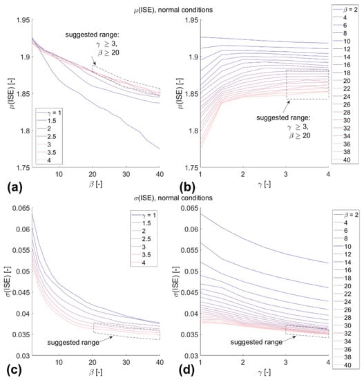 Hence, a total of 140 combinations were analysed. The range of was defined to not exceed the suggested ratio []. Accordingly, (as the product of the lowest values of both and ) ranges from a minimum of 2 to a maximum of 160.