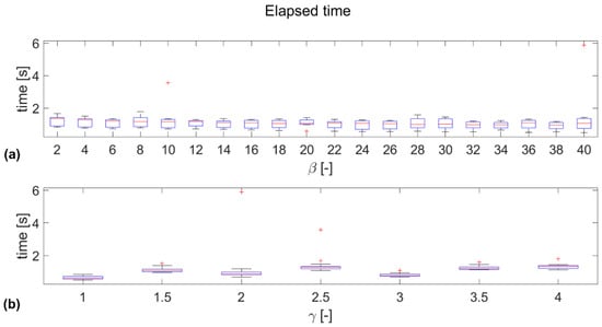 The CWT was found to be slightly longer to perform. As it can be seen from Figure 12, the elapsed time is mostly equal for any pair of values in the inspected ranges of the two GWT parameters. Except for (, ) and (, ), which lasted, respectively, for 5.8 s and 3.5 s, the CWT ran in less than 2.0 s everywhere else. Considering all cases, the overall mean elapsed time is about 1.08 s (1.02 s excluding the two outliers), with many combinations running in <1 s.